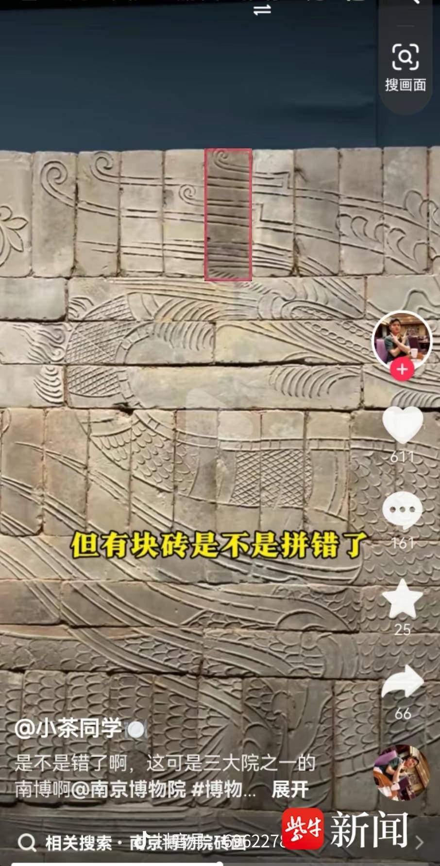 “家人們,我好像在南博發(fā)現(xiàn)了一件展品有一處錯(cuò)誤”,網(wǎng)友“小茶同學(xué)”發(fā)視頻表示,“1月25日去南京博物院游覽,在看到《羽人戲龍磚畫》時(shí),發(fā)現(xiàn)磚畫很精美,保留很完整。磚畫上的陽(yáng)刻線條尤其讓我感到震撼,看到深色磚的部分,我感覺(jué)有點(diǎn)別扭,當(dāng)時(shí)就臆想著那塊磚反過(guò)來(lái)是不是更好一點(diǎn),于是發(fā)了一個(gè)視頻求助?!?/p>