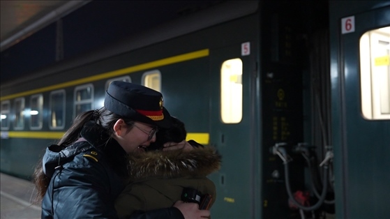 14號車廂內(nèi),來自黑龍江省齊齊哈爾市泰來縣的王興海和陳玉倩望著車窗外、站臺上的王靚怡,喜笑顏開。跨越2700多公里、歷時52個小時,只為給女兒一個驚喜,陪她在崗過年。