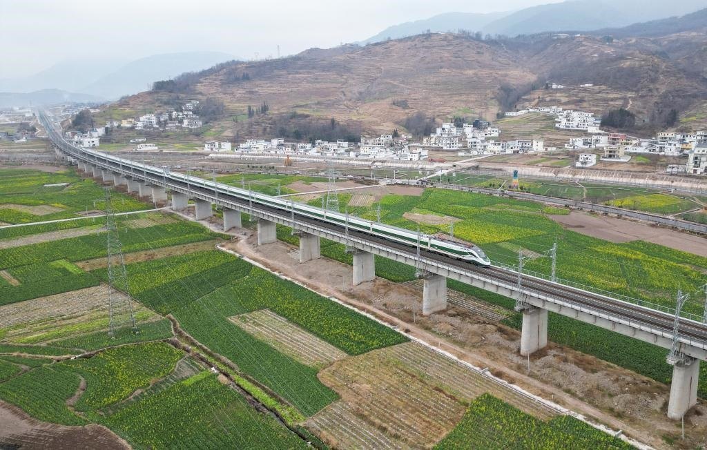 這是2月3日,一趟列車通過越西縣城郊(無人機(jī)照片)。新華社記者 王曦 攝