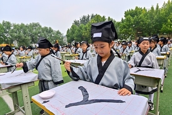 2023年9月1日,山東濰坊,青州市云門山路回民小學(xué),一年級(jí)新生用毛筆書寫“人”字。視覺中國供圖