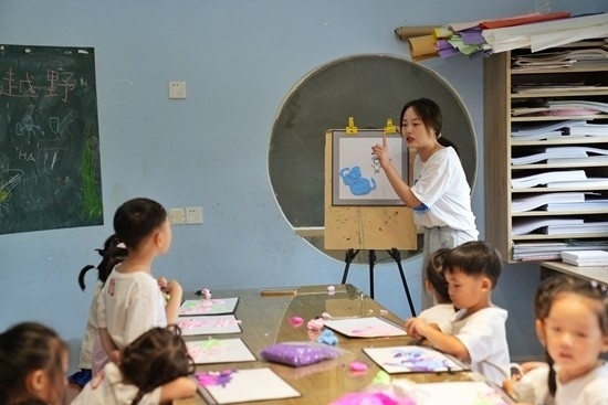 2022年7月21日,江西一幼兒園里的孩子在老師的指導(dǎo)下練習(xí)繪畫。視覺中國供圖