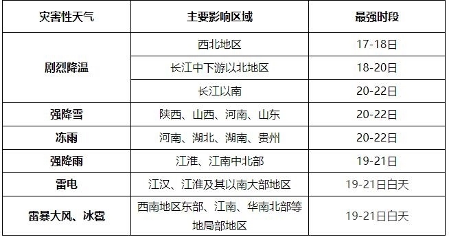 央視網(wǎng)消息:中央氣象臺預(yù)計,2月17日至22日寒潮天氣將影響我國,中東部地區(qū)氣溫起伏劇烈,大部地區(qū)降溫10~18℃,局地氣溫降幅可達(dá)20℃以上;全國大部有明顯雨雪天氣,其中陜西、山西、河南、山東等地有暴雪,局地大暴雪;河南、湖北、湖南、貴州將先后出現(xiàn)凍雨;江淮、江南中北部局地有暴雨,南方地區(qū)有大范圍雷電和局地強對流天氣。