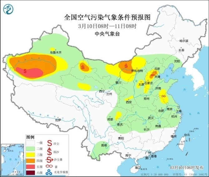 另外,受大風(fēng)天氣影響,10日,內(nèi)蒙古中西部、寧夏北部、甘肅河西、青海北部等地的部分地區(qū)有揚(yáng)沙或浮塵。請(qǐng)公眾戶外活動(dòng)做好防風(fēng)防沙措施,室內(nèi)關(guān)好門窗。
