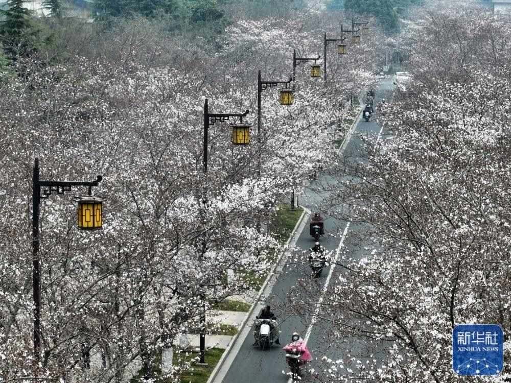 3月23日拍攝的江蘇省揚州市鑒真路的“櫻花大道”景色(無人機(jī)照片)。新華社發(fā)(孟德龍攝)