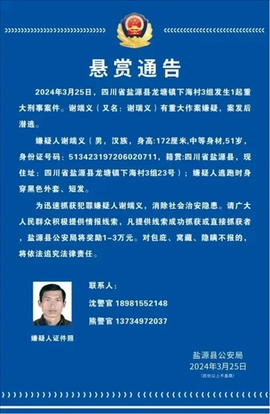 ·四川51歲男子涉重大刑案在逃,警方懸賞萬元緝拿。