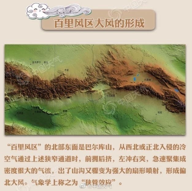 “百里風區(qū)”的北部東面是巴爾庫山,從冷空氣通過上述狹窄通道時,前擁后擠,左沖右突,急速聚集成密度很大的氣流,出了山溝又驟變?yōu)閺姶蟮纳刃螄娚洹?/p>