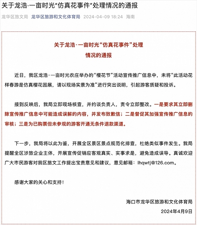 ·海口一農(nóng)莊辦“櫻花節(jié)”樹上全是假花?官方通報(bào):約談責(zé)任人,責(zé)令立即整改。