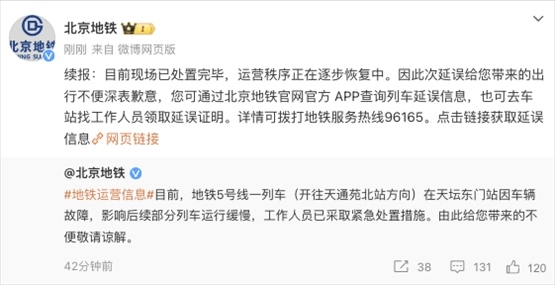 央視網消息:據@北京地鐵 微博消息,目前現場已處置完畢,運營秩序正在逐步恢復中。此前,北京地鐵發(fā)文稱,地鐵5號線一列車(開往天通苑北站方向)在天壇東門站因車輛故障,影響后續(xù)部分列車運行緩慢,工作人員已采取緊急處置措施。