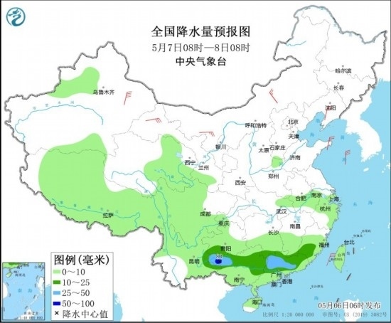 全國降水量預(yù)報圖(5月6日08時-7日08時)