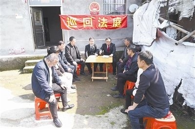 陳某因未履行贍養(yǎng)義務(wù),被87歲的老母親訴至法院。為解開母子間的心結(jié)、修復(fù)親情,庭審過程中,法官聯(lián)合當(dāng)?shù)劓?zhèn)、村干部,邀請雙方親屬共同參與調(diào)解。最終,母子二人達(dá)成調(diào)解協(xié)議,陳某當(dāng)場支付了贍養(yǎng)費(fèi)。圖為巡回審判現(xiàn)場。