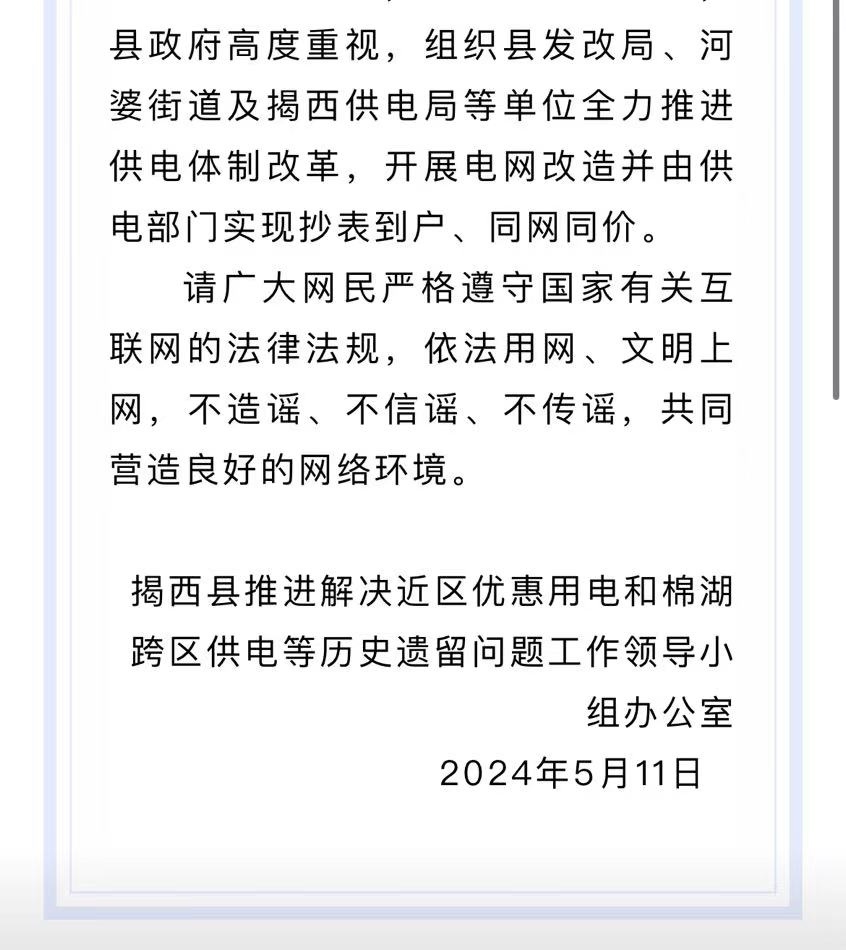 針對(duì)此事,“揭西發(fā)布”微信公眾號(hào)于5月12日發(fā)布了情況說(shuō)明,表示對(duì)網(wǎng)上反映的“村民稱電費(fèi)從3毛漲到6毛8交不起”的問(wèn)題高度重視,并已立即開展調(diào)查。