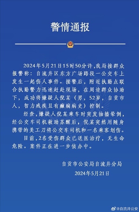 ·四川自貢警方通報(bào)“一男子在公交車(chē)上用美工刀劃傷司機(jī)和乘客”:男子智力殘疾且患有癲癇病史。
