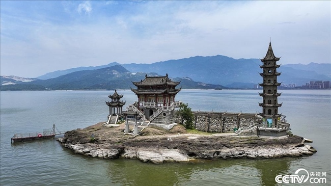 江西鄱陽(yáng)湖進(jìn)入豐水期,位于江西省廬山市境內(nèi)的鄱陽(yáng)湖標(biāo)志性景觀落星墩,隱入湖中成為“水中樓閣”。