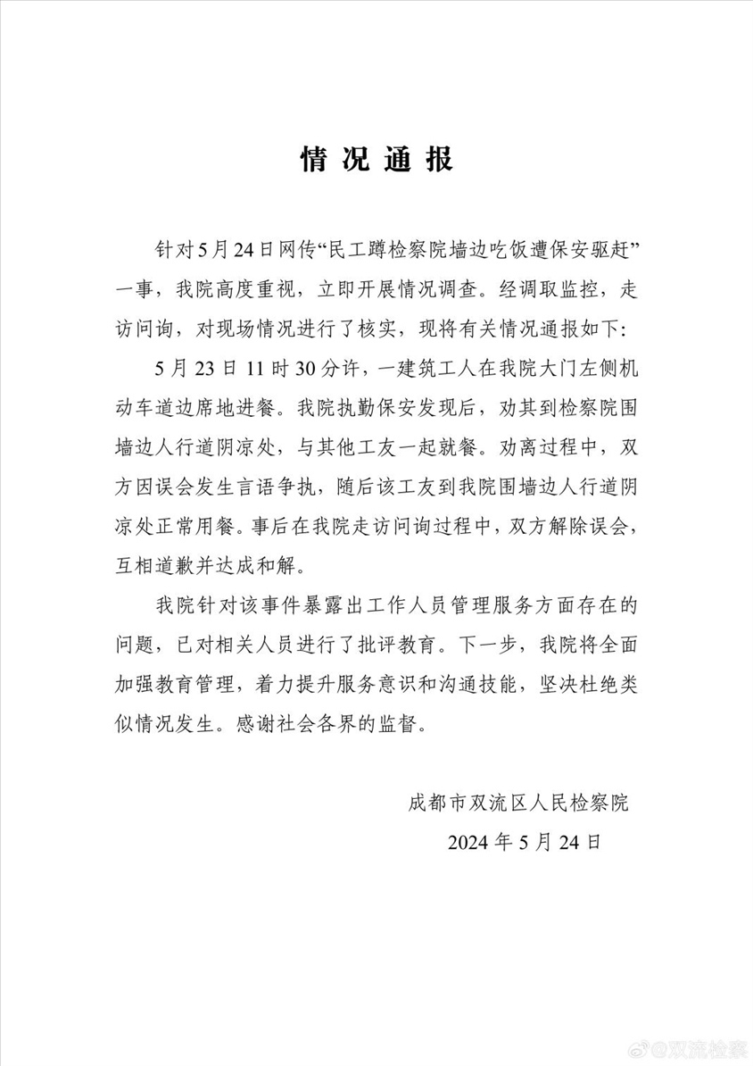 ·成都雙流檢察院回應(yīng)“民工蹲墻邊吃飯?jiān)獗0豺?qū)趕”:系誤會已和解。