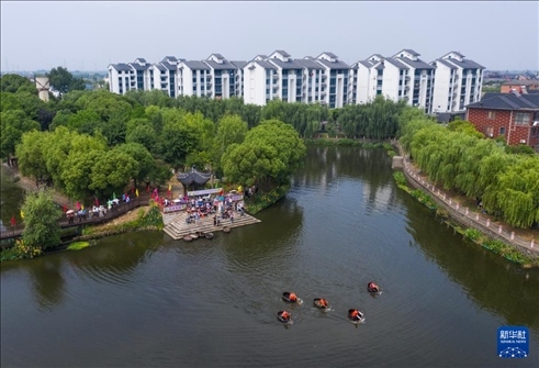 5月25日,村民們參加水鄉(xiāng)劃菱桶比賽。菱桶是河網(wǎng)密布的東林鎮(zhèn)百姓家中常見(jiàn)的一種傳統(tǒng)水上勞動(dòng)工具,村民在捕魚(yú)、采菱、采荷時(shí)都要用到(無(wú)人機(jī)照片)。