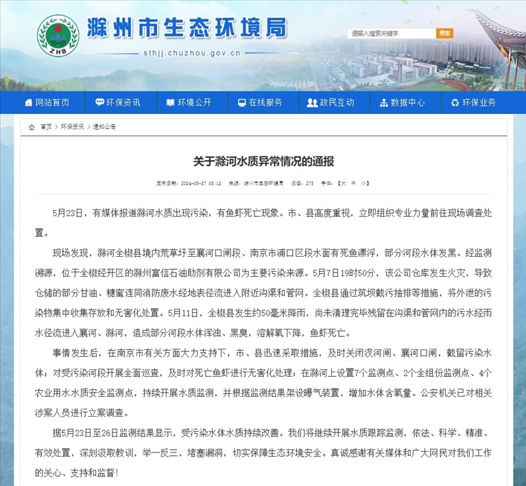 現(xiàn)場(chǎng)發(fā)現(xiàn),滁河全椒縣境內(nèi)荒草圩至襄河口閘段、南京市浦口區(qū)段水面有死魚漂浮,部分河段水體發(fā)黑。經(jīng)監(jiān)測(cè)溯源,位于全椒經(jīng)開(kāi)區(qū)的滁州富信石油助劑有限公司為主要污染來(lái)源。5月7日19時(shí)50分,該公司倉(cāng)庫(kù)發(fā)生火災(zāi),導(dǎo)致倉(cāng)儲(chǔ)的部分甘油、糖蜜連同消防廢水經(jīng)地表徑流進(jìn)入附近溝渠和管網(wǎng)。全椒縣通過(guò)筑壩截污抽排等措施,將外泄的污染物集中收集存放和無(wú)害化處置。5月11日,全椒縣發(fā)生約50毫米降雨,尚未清理完畢殘留在溝渠和管網(wǎng)內(nèi)的污水經(jīng)雨水徑流進(jìn)入襄河、滁河,造成部分河段水體渾濁、黑臭,溶解氧下降,魚蝦死亡。公安機(jī)關(guān)已對(duì)相關(guān)涉案人員進(jìn)行立案調(diào)查。