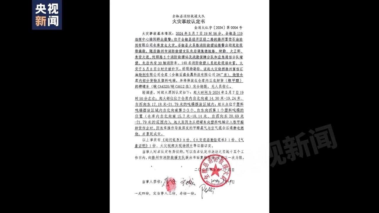 記者從全椒縣消防救援大隊于5月24日出具的火災事故認定書上發(fā)現(xiàn),5月7日晚上7點多,滁州富信助劑有限公司倉庫發(fā)生火災,滁州市消防救援支隊調(diào)集30輛消防車、140名消防救援人員現(xiàn)場處置,火災于5月8日0時許撲滅。經(jīng)現(xiàn)場勘驗,該起火災燒損滁州富信石油助劑有限公司倉庫、燒毀倉庫內(nèi)部分貨物及塑料噸桶,并將停放在倉庫內(nèi)正在卸粗甲醇的槽罐車完全燒毀,無人員傷亡。