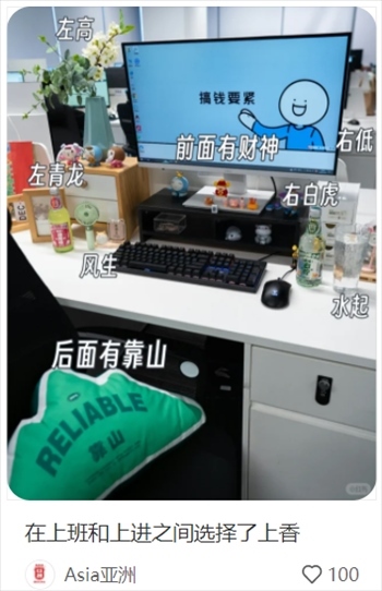 有網友分享工位的風水大有講究:擺滿綠植象征欣欣向榮,整體布置左高右低;后背有靠,面不對門;左靠窗,水杯放左邊,寓意風生水起;雜物放桌面左邊,右邊越簡約越好。