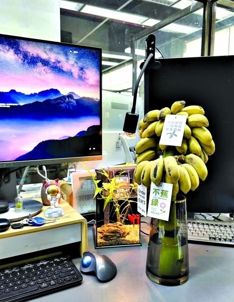 “現(xiàn)在大家工作都挺累的,職場里稍微有一點令人感到驚喜和有趣的話題,大家好像就會變得很開心?!眳芹谑且幻来畈┲?,自從他開始在辦公桌上養(yǎng)香蕉之后,單位的很多同事都會好奇地走過來瞧瞧。