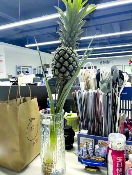 00后楊三日從事新媒體運營工作,她在工位上養(yǎng)了一個菠蘿,“養(yǎng)菠蘿是一件很酷的事情,不僅能觀賞,還能吃,很配我特立獨行的氣質。”她說自從養(yǎng)了菠蘿之后,每天上班時心情就變得非常好?!拔业墓の痪拖駸釒в炅忠粯樱崆斑M入了春天。”