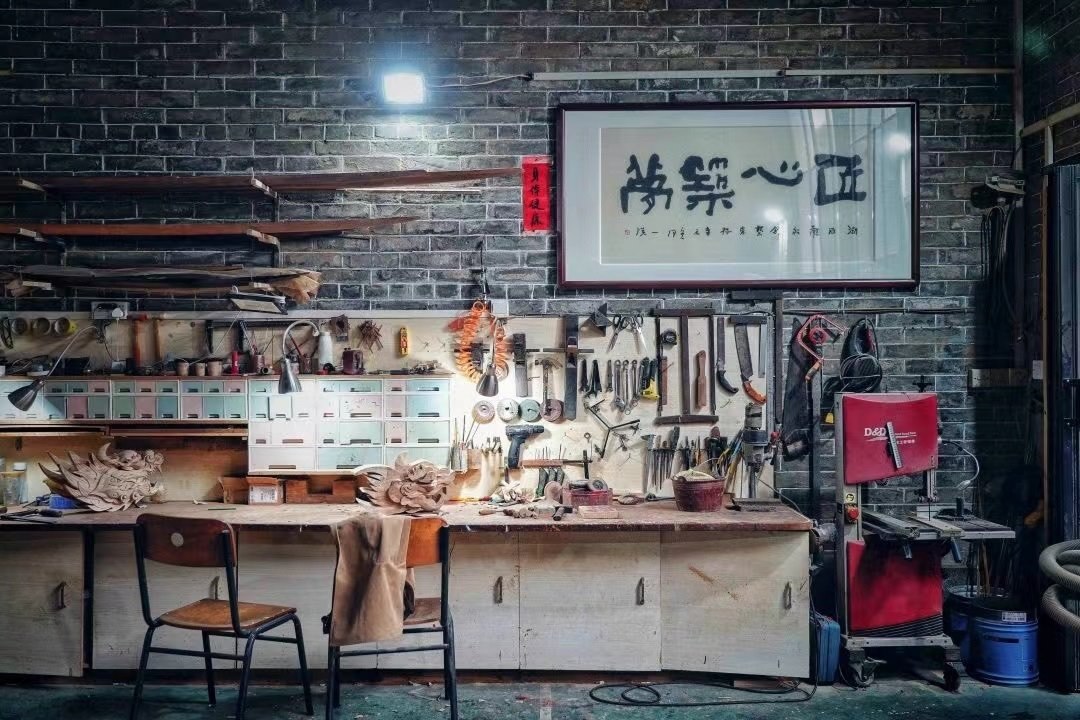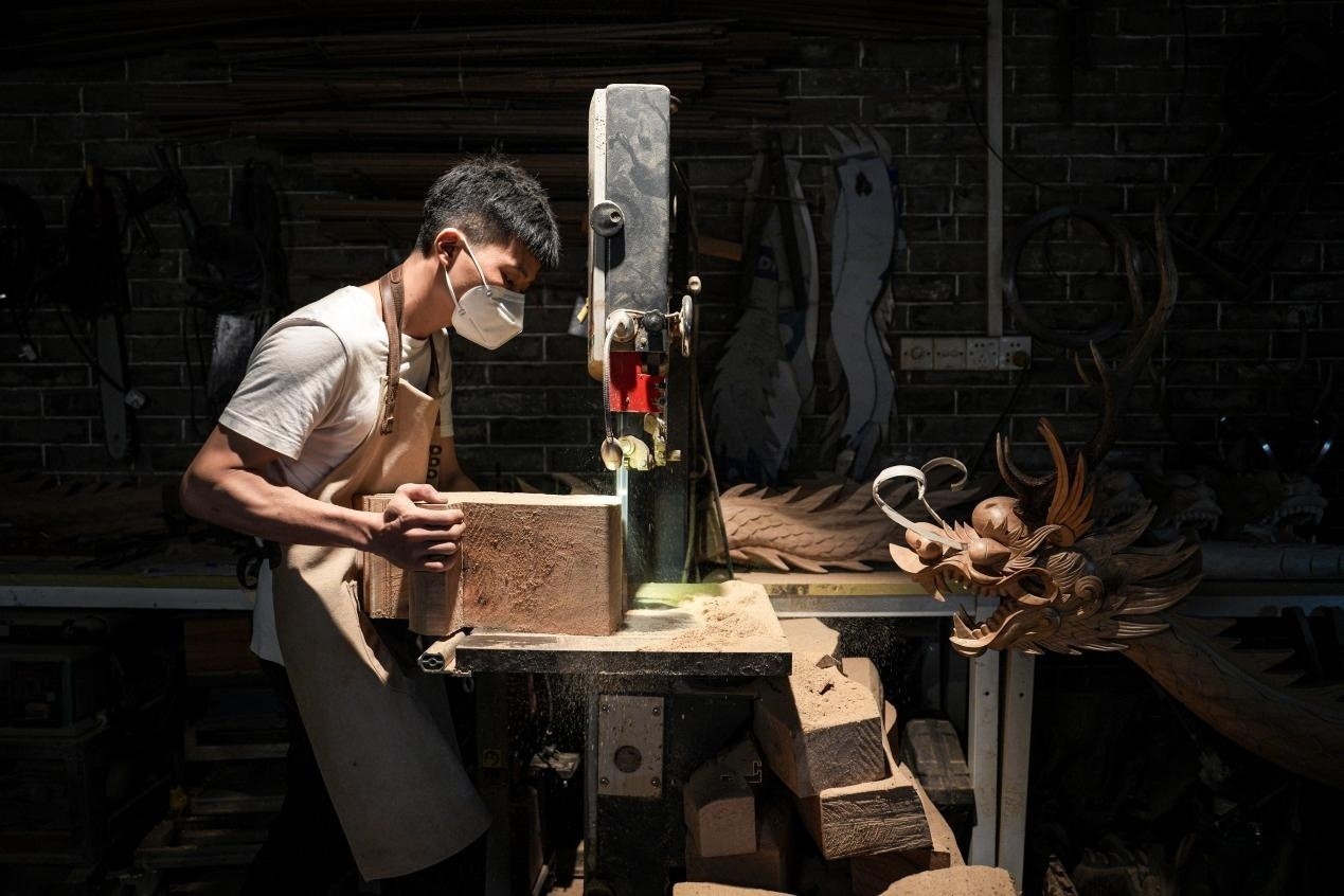 張偉潮身上的傷也沒斷過。“天天跟刀打交道,有時(shí)候傷口剛縫了線,回到家一干活,刀口又開了”,手臂上、手背上遍布的傷疤,見證了每一個(gè)龍頭的誕生?!懊肯乱坏?,我都已經(jīng)想好了后面的第二步、第三步”,龍頭雕刻極為考究,從選料、切割,到粗雕、精雕,再到打磨、拋光、裱漆,十幾道繁瑣工序,全靠師傅的眼光和手藝。機(jī)械化、流水線,做不出龍頭嗎?在數(shù)不清的日夜里,光影斑駁間,張偉潮拿著父輩傳下的一刀一錘,一下一下,慢慢開鑿,給出自己的答案。