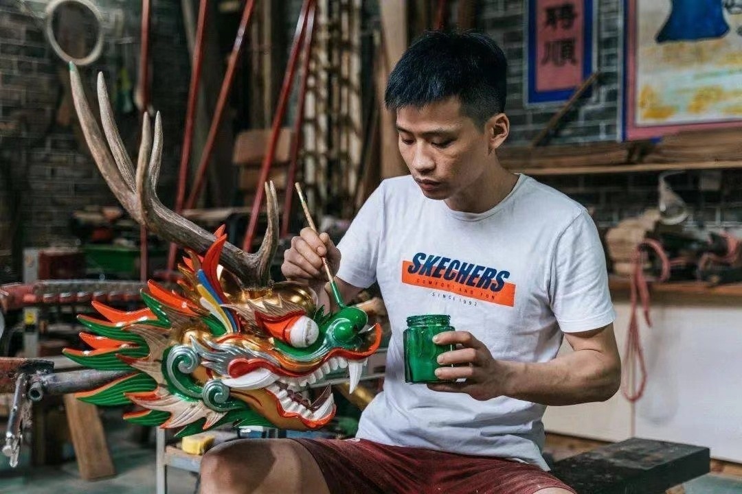 十五年間,張偉潮已記不清他雕刻或翻新了多少龍頭,同樣的刀銼雕鏤,卻是各不相同的勇猛威嚴(yán),慈眉善目。形態(tài)各異的龍頭之上,承載的是一個(gè)村落的鄉(xiāng)愁,一支隊(duì)伍的雄心,一方百姓的豪情。最初一家三口扛起的小作坊,也迎來(lái)了越來(lái)越多的年輕學(xué)徒。