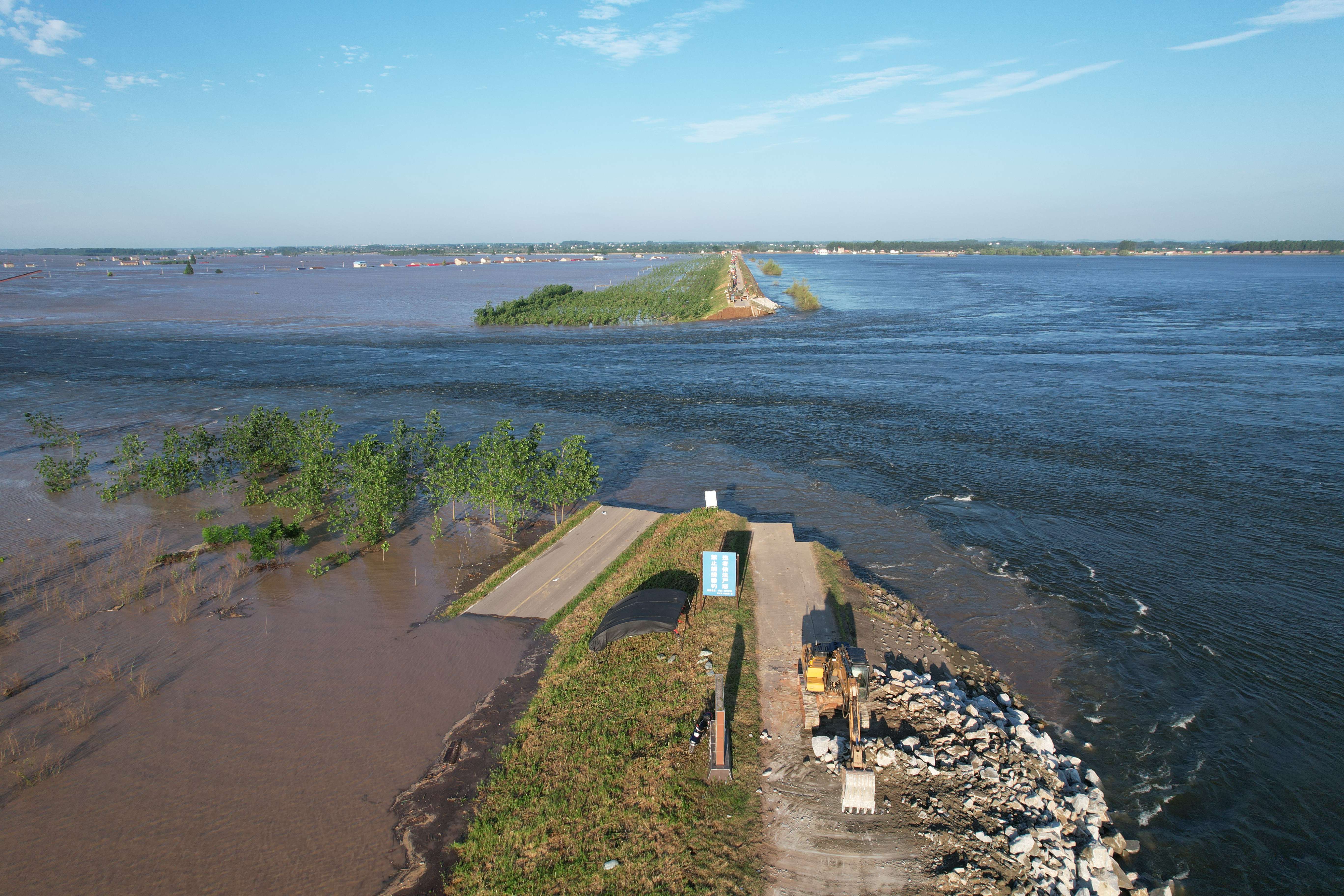 目前,前線正加緊組織工程機械加緊施工,在決口兩端建設(shè)4個倒車平臺,并在決口兩端傾倒大型石塊,建設(shè)‘裹頭’,減緩水流對決口沖刷,防止決口擴大。