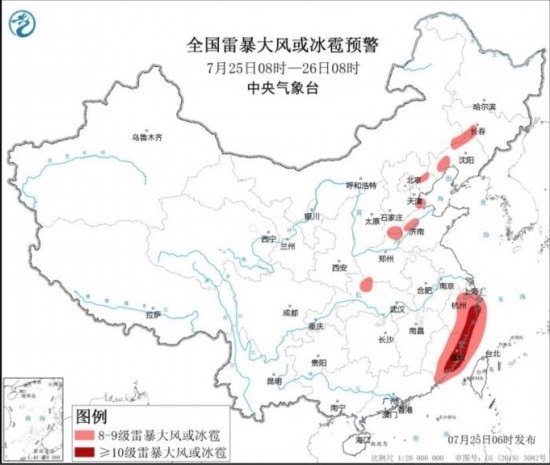 全國(guó)雷暴大風(fēng)或冰雹預(yù)警圖(7月25日08時(shí)-26日08時(shí))