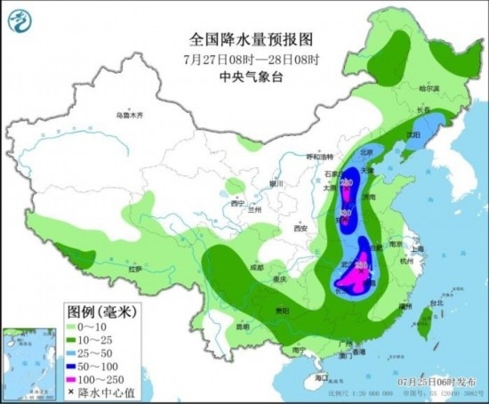7月27日08時(shí)至28日08時(shí),東北地區(qū)南部、北京、天津、河北中部、河南中東部、山東西部、安徽西部、湖北東部、湖南東部、江西北部等地部分地區(qū)有大到暴雨,其中,河北中南部、河南中部、湖北東南部、湖南東北部、江西西北部等地部分地區(qū)有大暴雨(100~230毫米)。
