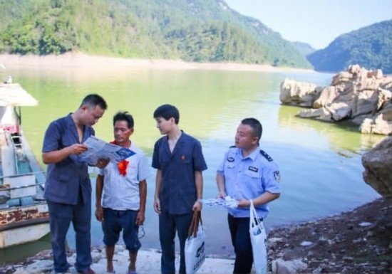 圖③:干警向兩岸過渡村民發(fā)放普法資料,并提醒他們乘船時(shí)注意安全。