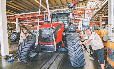 八月二十七日,山東青州經(jīng)濟(jì)開(kāi)發(fā)區(qū)一家大馬力拖拉機(jī)制造企業(yè)內(nèi),工人正在車(chē)間進(jìn)行裝配作業(yè)。王繼林?jǐn)z(人民視覺(jué))