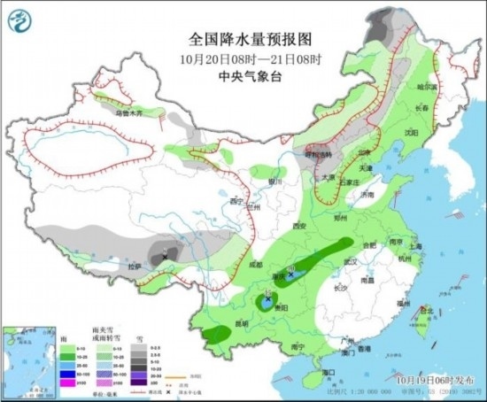 10月19日08時(shí)至20日08時(shí),內(nèi)蒙古西北部、新疆北疆北部和東部、西藏北部和東部、青海北部和南部、甘肅河西、川西高原北部等地部分地區(qū)有小雪或雨夾雪,其中,新疆北疆北部和北疆東部、西藏東部和南部等地部分地區(qū)有中到大雪(5~8毫米)。內(nèi)蒙古西部、西北地區(qū)東北部、湖南南部、西南地區(qū)東部、廣西西南部等地部分地區(qū)有中到大雨,其中,四川盆地西北部、重慶中西部等地部分地區(qū)有暴雨(50~80毫米)。浙江北部部分地區(qū)有4~6級(jí)風(fēng),其中,黑龍江東北部、西藏北部等地部分地區(qū)有6~7級(jí)風(fēng)。