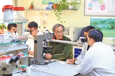 中國科學院院士宋微波(中)在指導學生開展科研。