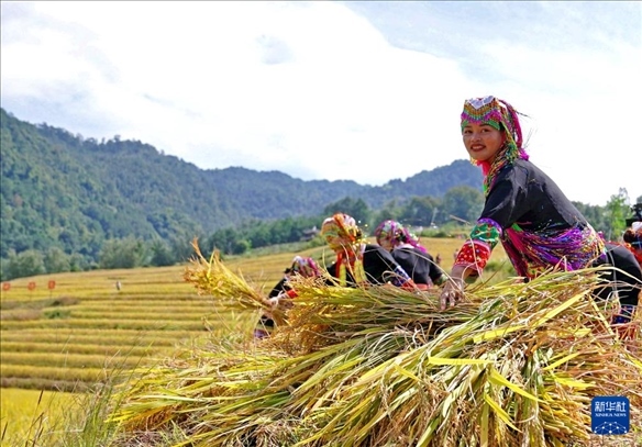 10月26日,瑤族群眾在廣西防城港市上思縣南屏瑤族鄉(xiāng)百馬梯田收割稻谷。