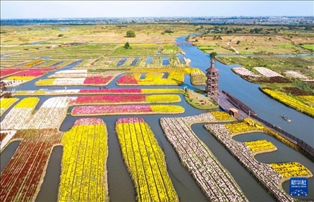 10月25日,游客在江蘇省興化市千垛景區(qū)賞菊游玩(無人機照片)。