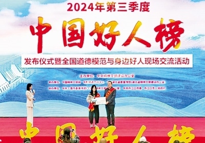 30多年堅(jiān)守海上救援的“漁家子弟”董建海,數(shù)九寒天跳入冰窟救人獻(xiàn)出生命的普通村民高元嶺,自愿守護(hù)烈士英靈43載的退伍老兵顧平,犧牲在防汛一線的90后基層干部李東,21年不離不棄照料患病親人的好兒媳王秀杰……11月12日,由中央精神文明建設(shè)辦公室主辦的2024年第三季度“中國(guó)好人榜”發(fā)布儀式暨全國(guó)道德模范與身邊好人現(xiàn)場(chǎng)交流活動(dòng)在湖北省十堰市舉辦,經(jīng)各地推薦、網(wǎng)友評(píng)議和專家評(píng)審等環(huán)節(jié),共有152人(組)助人為樂(lè)、見(jiàn)義勇為、誠(chéng)實(shí)守信、敬業(yè)奉獻(xiàn)、孝老愛(ài)親身邊好人光榮上榜。