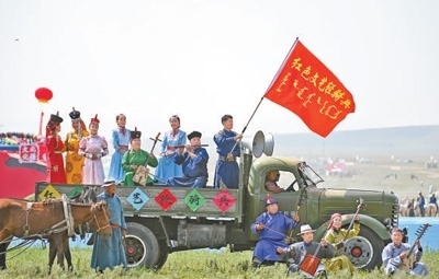 滋潤(rùn)人心“紅色文藝輕騎兵”烏蘭牧騎隊(duì)員在內(nèi)蒙古草原那達(dá)慕開幕式上表演。新華社記者 貝 赫攝