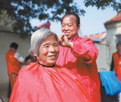 德化人心山東省東營(yíng)市廣饒縣開展形式多樣的活動(dòng),弘揚(yáng)愛(ài)老敬老的優(yōu)良傳統(tǒng)。圖為在廣饒縣李鵲鎮(zhèn)趙寺村,志愿者為老人理發(fā)。劉云杰攝(影像中國(guó))