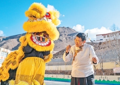 凝聚人心融合了漢藏特色表演形式的碩督鎮(zhèn)獅子舞,見證著西藏各民族交往交流交融的歷史。鄧巴阿尼是西藏昌都市非物質(zhì)文化遺產(chǎn)碩督鎮(zhèn)獅子舞的傳承人,近年來(lái)致力于獅子舞傳承。圖為鄧巴阿尼(右)在昌都市洛隆縣碩督鎮(zhèn)小學(xué)指導(dǎo)學(xué)生跳獅子舞。新華社記者 丁增尼達(dá)攝