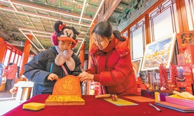 除夕,游客在慶成宮后殿的文創(chuàng)空間里拓印“福”字。