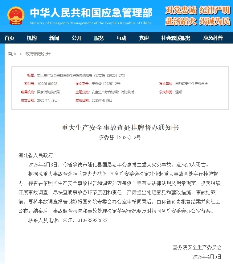 人民網(wǎng)北京4月9日電 (記者溫璐、郝萍)據(jù)應(yīng)急管理部消息,4月9日,國務(wù)院安全生產(chǎn)委員會發(fā)布向河北省人民政府發(fā)布重大生產(chǎn)安全事故查處掛牌督辦通知書。通知書稱,2025年4月8日,河北省承德市隆化縣國恩老年公寓發(fā)生重大火災(zāi)事故,造成20人死亡。根據(jù)《重大事故查處掛牌督辦辦法》,國務(wù)院安委會決定對該起重大事故查處實(shí)行掛牌督辦。河北省要依照《生產(chǎn)安全事故報(bào)告和調(diào)查處理?xiàng)l例》等有關(guān)法律法規(guī)及規(guī)章規(guī)定,抓緊組織開展事故調(diào)查,盡快查明事故各環(huán)節(jié)原因和責(zé)任,嚴(yán)肅提出處理意見和整改措施。事故結(jié)案前,要將事故調(diào)查報(bào)告(稿)報(bào)國務(wù)院安委會辦公室審核同意后,由河北省負(fù)責(zé)批復(fù)結(jié)案并向社會公布。結(jié)案后,事故調(diào)查報(bào)告和事故處理決定落實(shí)情況要及時報(bào)國務(wù)院安委會辦公室備案。