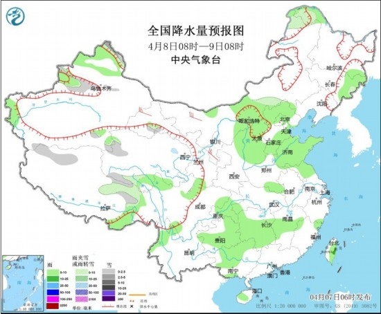 4月8日08時至9日08時,新疆北部、內蒙古中東部、西藏北部、青海南部等地有小到中雪或雨夾雪,內蒙古中部、陜西北部、山西、河北北部和南部、山東、貴州東部和南部、湖南中南部、江西中部、廣西中北部、海南島、臺灣島等地有小到中雨。內蒙古大部、甘肅河西、陜西中北部、山西等地部分地區(qū)有4~6級風,陣風7級。