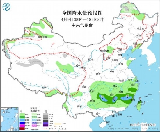 全國降水量預報圖(4月8日08時-9日08時) 圖片來源:中央氣象臺網站