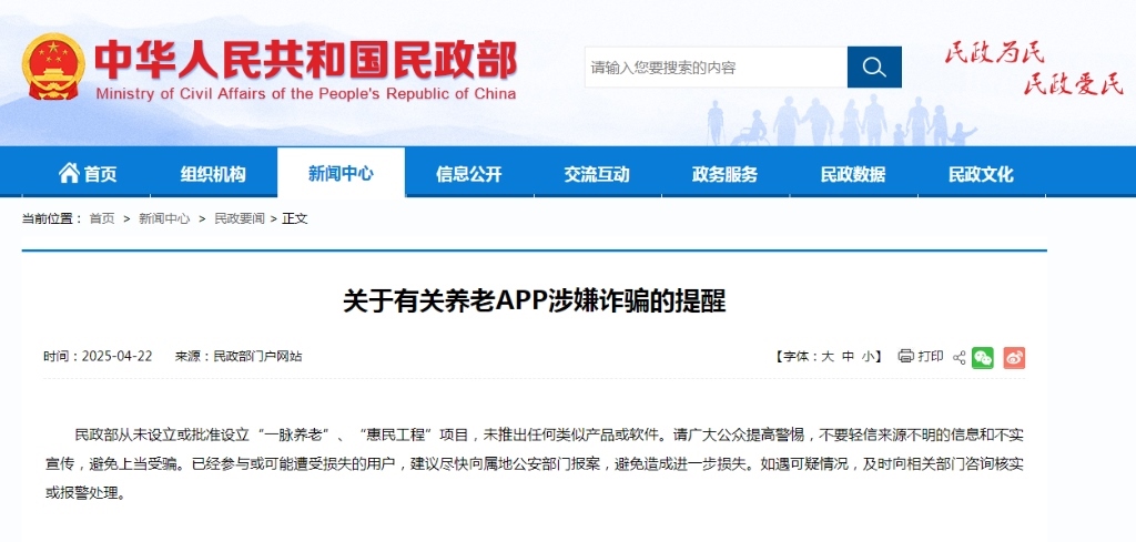 民政部發(fā)布有關(guān)養(yǎng)老APP涉嫌詐騙的提醒