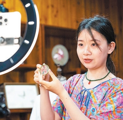 桃源刺繡非物質(zhì)文化遺產(chǎn)代表性傳承人肖瑤在直播。