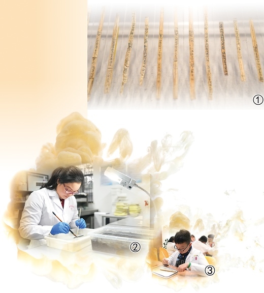 “要經(jīng)過一系列的保護(hù)流程,才能讓枚枚簡牘從糊滿泥土、通體發(fā)黑、糟朽脆弱的狀態(tài)恢復(fù)到具有足夠強(qiáng)度支撐、文字墨跡可辨別釋讀的程度?!苯鹌秸f。
