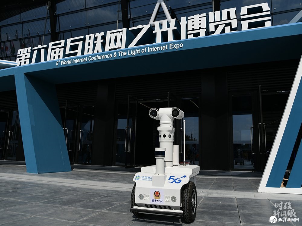 △這是“互聯(lián)網(wǎng)之光”博覽會展館前的5G警用機(jī)器人。