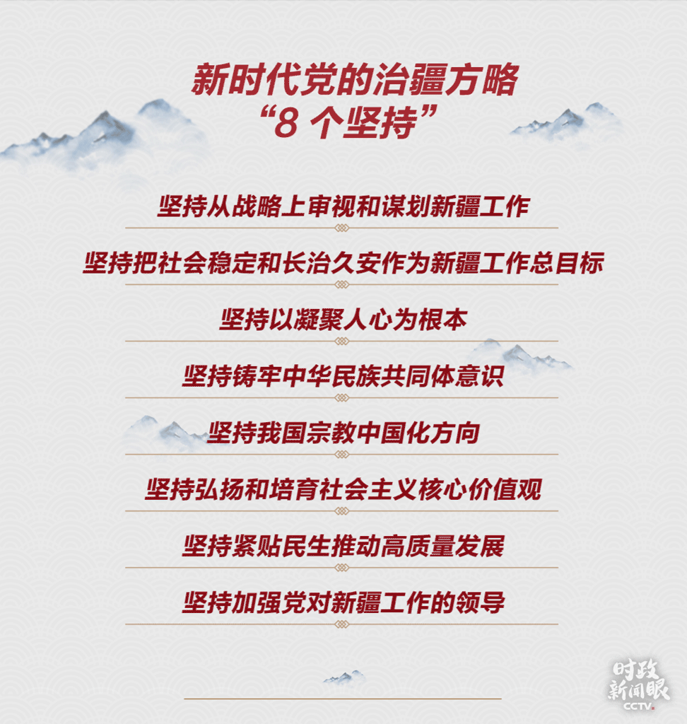 就在此次座談會一個(gè)月前,總書記在中央第七次西藏工作座談會上以“10個(gè)必須”概括了新時(shí)代黨的治藏方略,其中寫入了總書記多次談到的戰(zhàn)略思想:“治國必治邊、治邊先穩(wěn)藏”。而在新時(shí)代黨的治疆方略中,也重申了多次強(qiáng)調(diào)的新疆工作總目標(biāo):“社會穩(wěn)定、長治久安”。