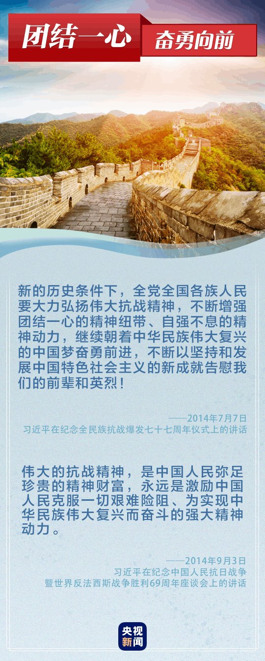“偉大的抗戰(zhàn)精神,永遠是激勵中國人民克服一切艱難險阻、為實現(xiàn)中華民族偉大復興而奮斗的強大精神動力?!薄罢x必勝!和平必勝!人民必勝!”黨的十八大以來,習近平總書記多次談到抗戰(zhàn)精神。讓我們重溫總書記重要論述,銘記歷史、奮勇向前。