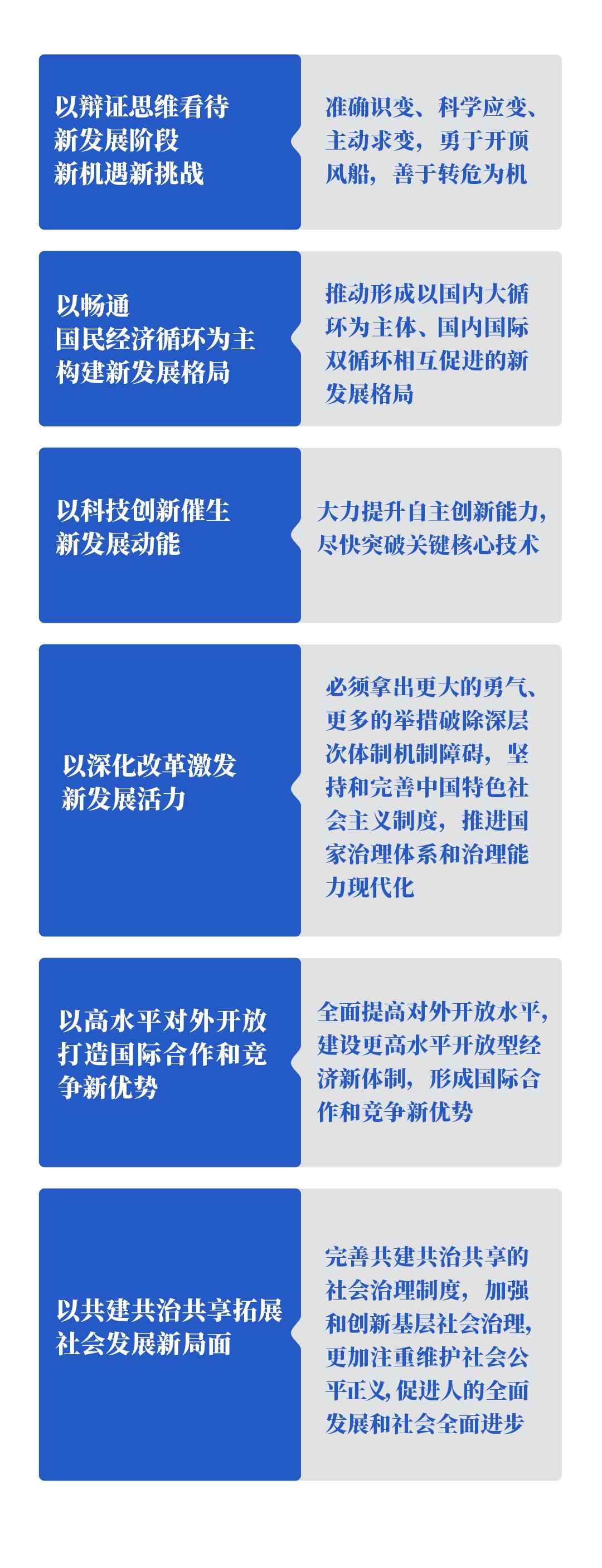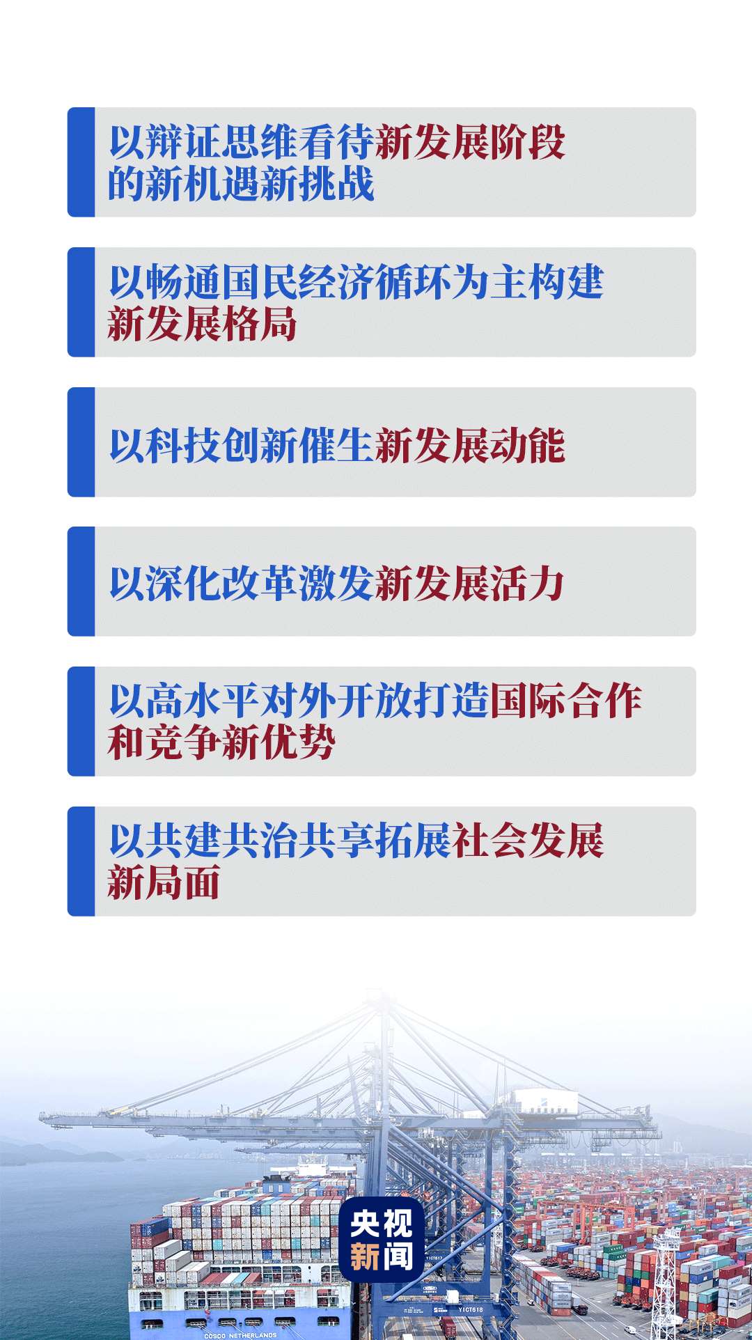 在經濟社會領域專家座談會上,習近平從黨和國家事業(yè)發(fā)展的戰(zhàn)略全局出發(fā),從新發(fā)展階段、新發(fā)展格局、新發(fā)展動能、新發(fā)展活力、國際合作和競爭新優(yōu)勢、社會發(fā)展新局面等方面提出要求。這六點要求為正確認識和把握中長期經濟社會發(fā)展重大問題指明了方向,是“十四五”規(guī)劃編制和未來經濟社會發(fā)展的重要遵循。